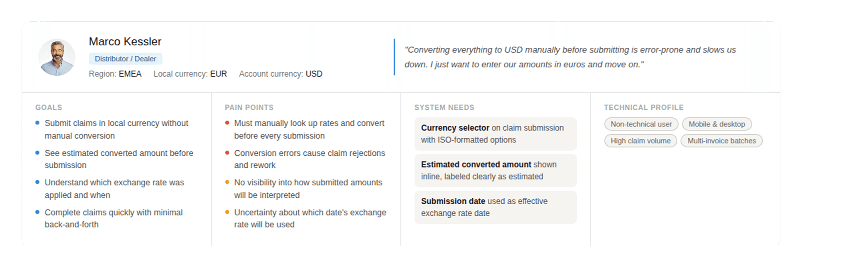 With distributors operating across EMEA, APAC, and LATAM, the platform's single-currency limitation was forcing manual FX conversions — creating errors and audit risk on both sides of the workflow. Research focused on two key personas — a distributor and an auditor — to identify where the process was breaking down and what a transparent multi-currency experience needed to deliver.