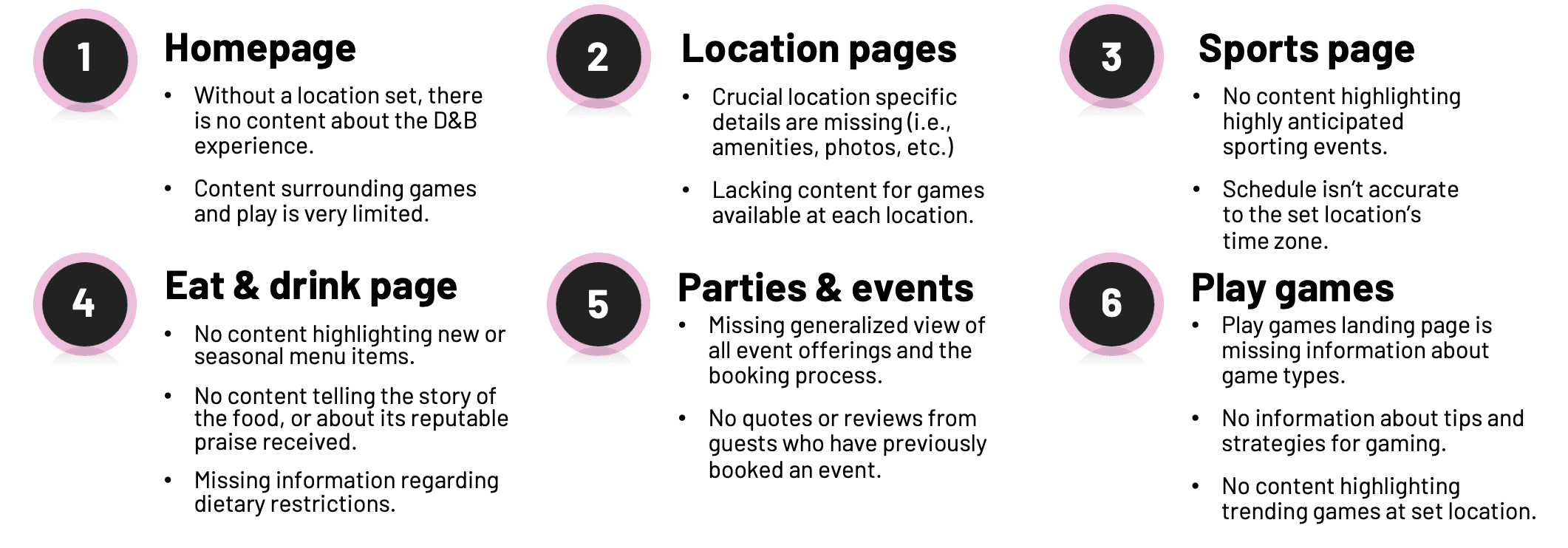 We audited 31 pages on the D&B site and found six key pages in need of critical content revamps. These pages are crucial to helping guests connect to D&B.