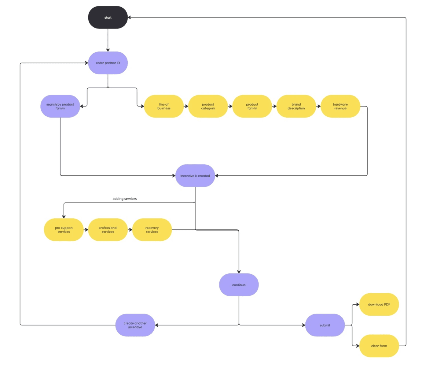 The incentives simulator will have one entry point and one exit point to make the flow simple. By simplifying the entry and exit, this will ensure that all users will have one type of flow, despite how many incentives they need to submit.